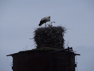 Потом было Новоселье. Это большое село, с многоквартирными пятиэтажными домами. Гуляющие подростки рассказали мне, что у них есть два гнезда. Первое находится на высокой ели. Снизу не видно живёт ли там кто-то, но хозяева соседнего дома сказали, что да, туда постоянно летают аисты, а недавно из гнезда выпал птенец.